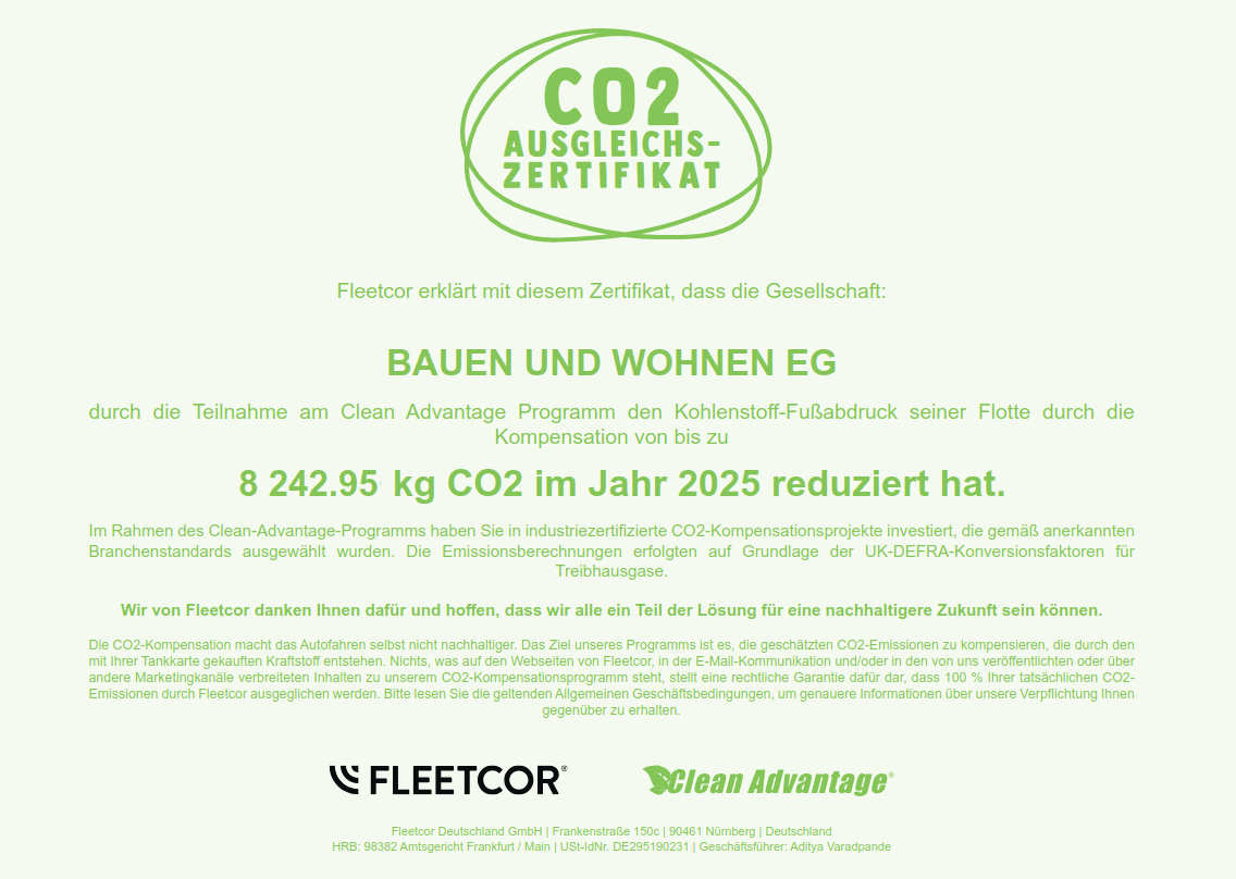 Dieses Zertifikat zeigt die positiven Maßnahmen, die wir ergreifen, um den Kohlenstoff-Fußabdruck abzuschwächen. Mit jedem gekauften Liter Kraftstoff werden die CO2-Emissionen berechnet und in branchenzertifizierte Klimaschutzprojekte vor Ort, in ganz Europa oder weltweit investiert.